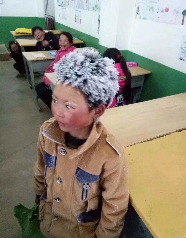 Восьмилетний мальчик из деревни Синьцзе стал знаменитым, когда его фотография попала в Интернет. Школьник прошагал по морозу в легкой одежде и без шапки. От такой прогулки брови и ресницы мальчика покрылись инеем, волосы буквально превратились в ледяные сосульки, а щеки горели огнем. Учитель сфотографировал отчаянного паренька и выложил снимок в соцсеть.