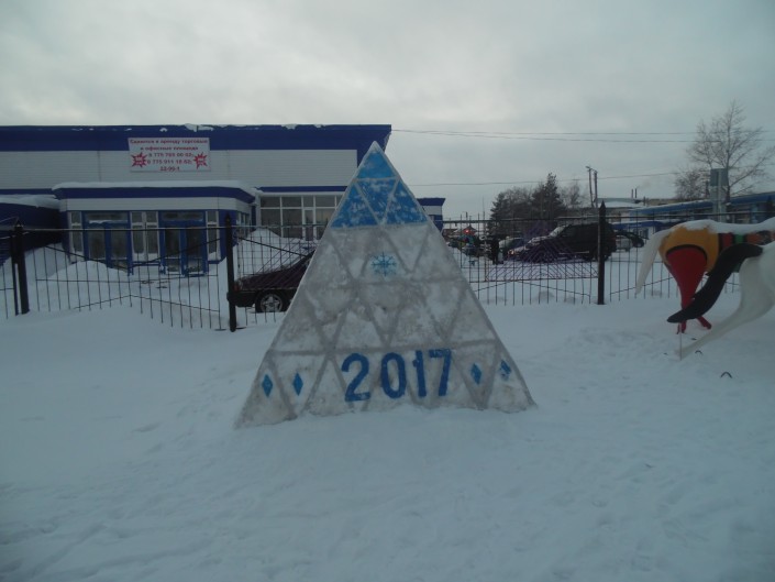 Снежный городок возвели еще в декабре. Основными темами вдохновения для умельцев стали 25-летие Независимости страны и предстоящая выставка EXPO-2017. Также мастера-любители слепили несколько мультипликационных персонажей, Деда Мороза, Снегурочку и символ года - петуха.