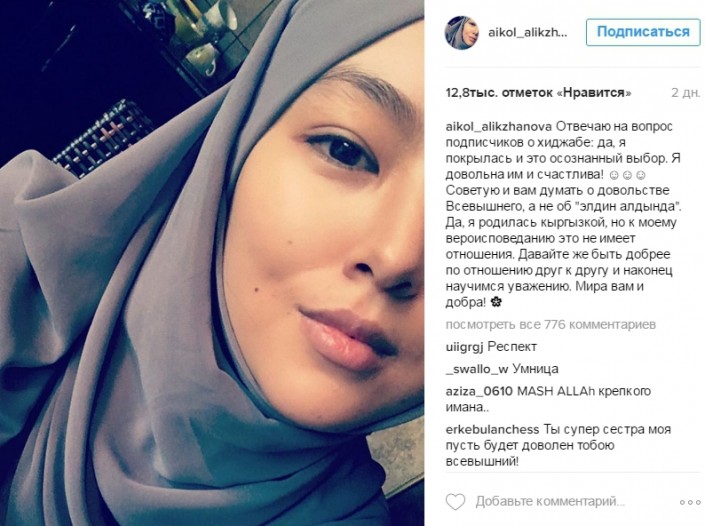 Известная кыргызская модель и актриса Айколь Аликжанова решила изменить свою жизнь. Обладательница титулов "Мисс Кыргызстан-2014", "Мисс Интернет KG-2012" надела хиджаб. Об этом она сообщила на своей странице в Instagram.