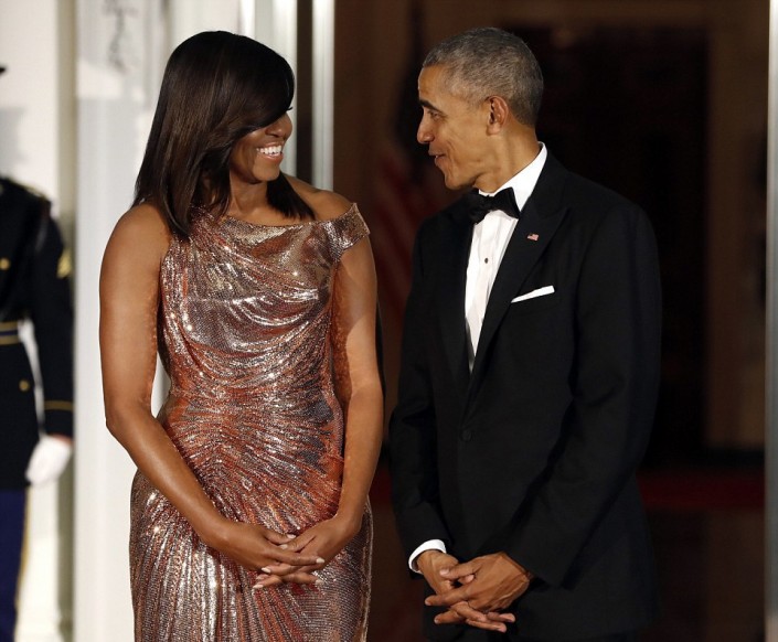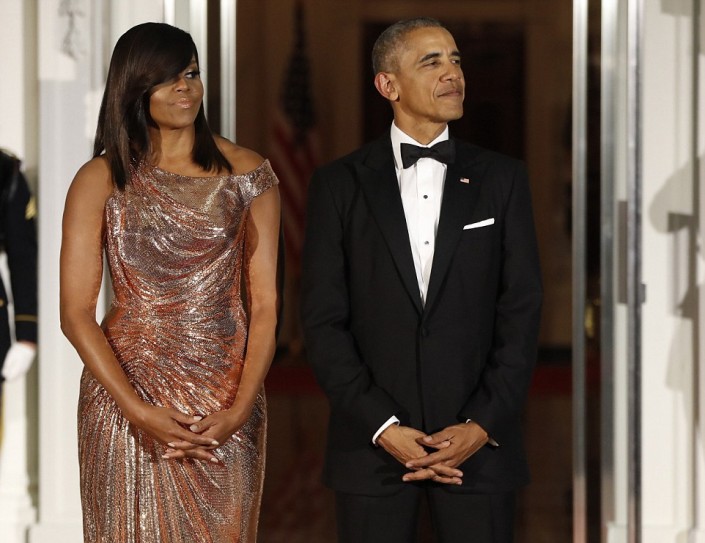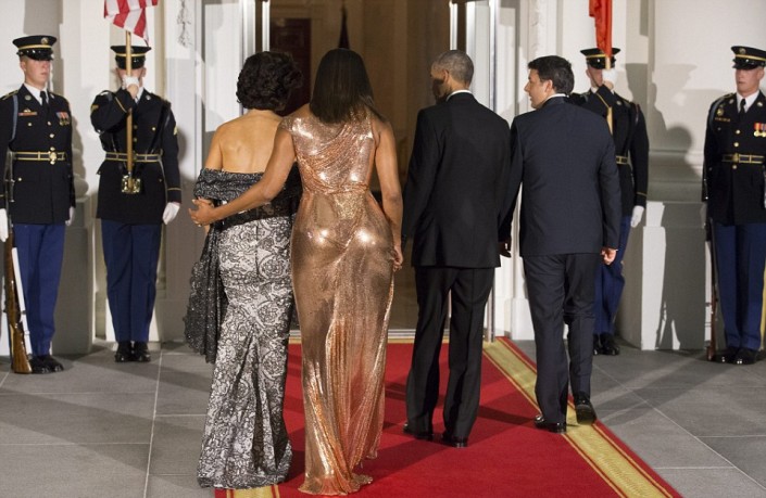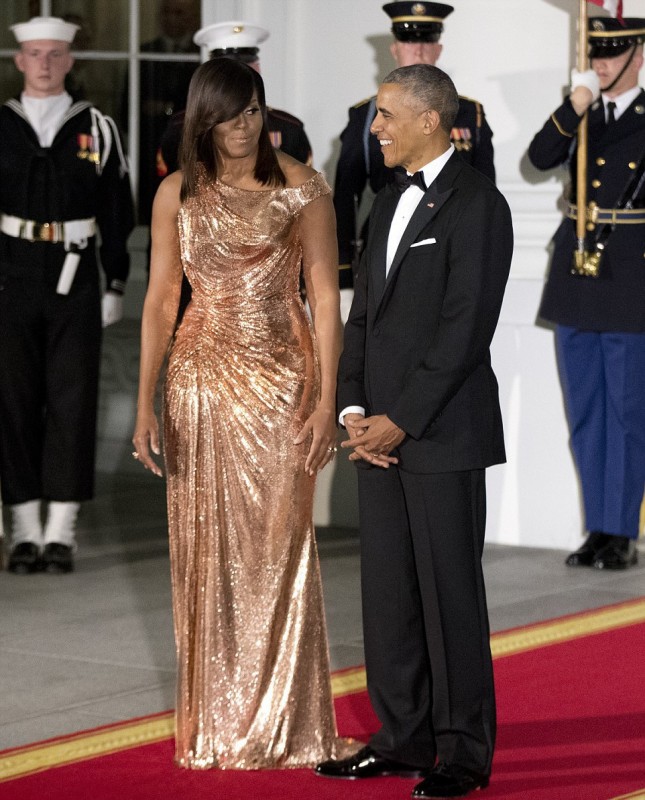 Впрочем, наибольшее внимание в этот вечер привлекла Мишель Обама. Она появилась перед гостями в ослепительном платье от Versace оттенка розового золота. Модель получила название Flotus. Наряд с ассиметричным кроем "на одно плечо" и сложными драпировками из ткани с металлизированной фактурой напоминал жидкое золото, струящееся вдоль тела.