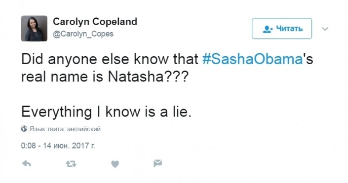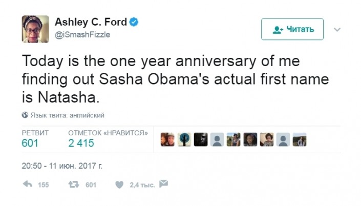 Бурю с соцсетях подняла репортер издания Refinery29 Эшли Форд. "Сегодня ровно год с того момента, как я узнала, что настоящее имя Саши Обамы Наташа", - написала она в Twitter.