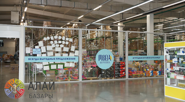 "Алай базары" располагает камерами для хранения мяса, овощей и фруктов, а также торговыми бутиками для арендаторов. Порадуйте своих детей широким ассортиментом детских товаров по оптовым ценам самого крупного гипермаркета "МЕГА-игрушка" (Россия).