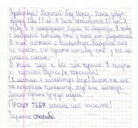 11-летний Эдуард живет с бабушкой. Мальчик мечтает о компьютере Asus. Но тут же в письме поясняет, что не обидется, если Дед Мороз подарит ему другую модель.