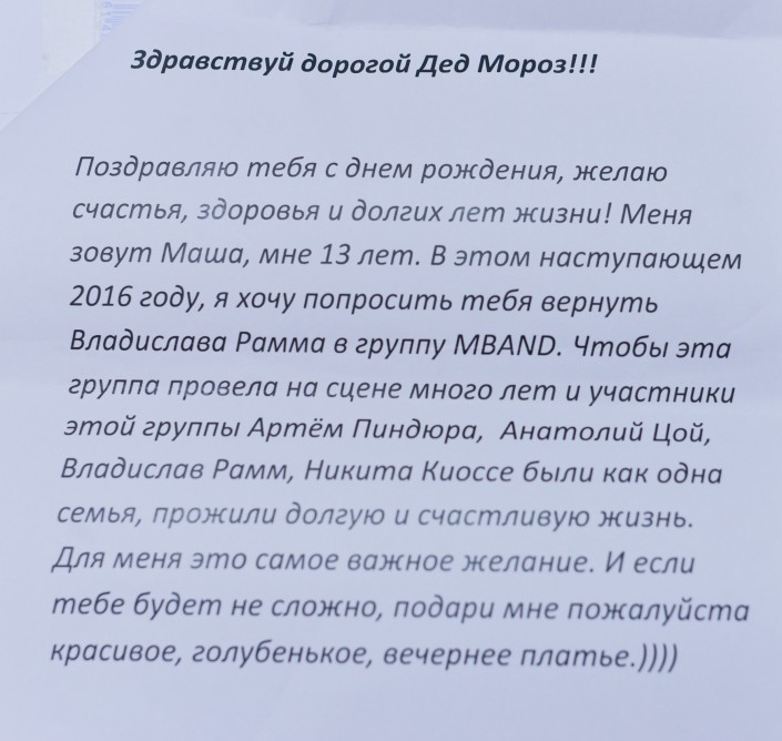 В этом году письма Деду Морозу отличились просьбами не материального характера. 13-летняя Маша просит вернуть в группу МBand Владислава Рамма.
