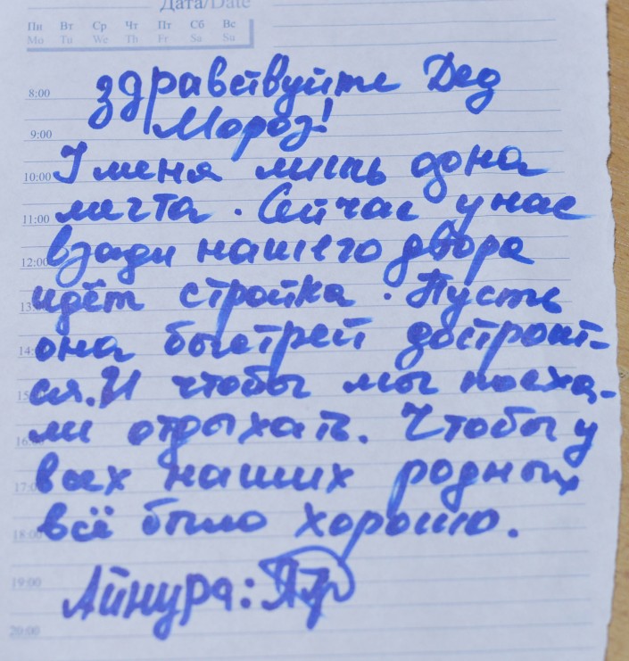 Ученица второго класса по имени Алинур просит подарки не только для себя, но и для своих двух сестренок и троих братишек. Семья из шести детей ждет Деда Мороза с игрушками и книжками.