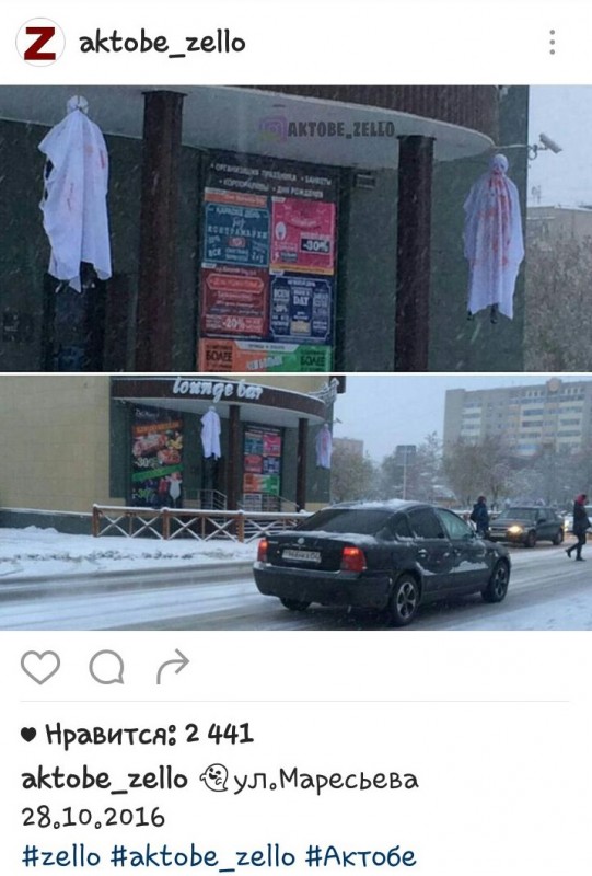 Одно из заведений в Актобе напугало местных жителей правдоподобными макетами "повешенных людей", которые появились у его входа в преддверии Хэллоуин, передает корреспондент Tengrinews.kz со ссылкой на аккаунт aktobe_zelo в Instagram.