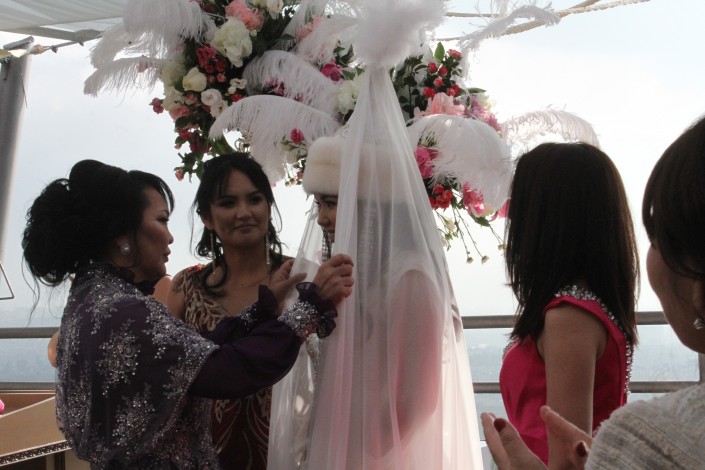 Перед церемонией бракосочетания состоялся казахский национальной обряд - беташар. Невеста была в традиционном казахском платье и саукеле. На этой церемонии присутствовали только родители молодых и самые близкие родственники.