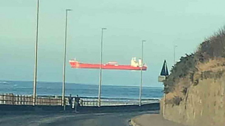 Ранее в Шотландии мужчина запечатлел огромный грузовой корабль, который будто парил над водой. Из-за схожих оттенков моря и неба корабль кажется парящим среди облаков. Киль корабля не виден, и с низко расположенными облаками трудно разглядеть, где заканчивается вода.