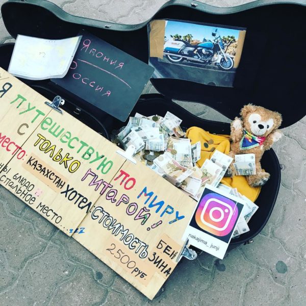 Накаджима Джунджи общается с казахстанцами на английском языке. В путь он отправился почти без денег. Не пополнил даже баланс на телефоне. Путешествует на "Харлее". Мощный двухцилиндровый двигатель разгоняет мотоцикл до 150 километров в час. На бензин и еду японец зарабатывает игрой на гитаре. После Петропавловска он отправится в Астану на EXPO.