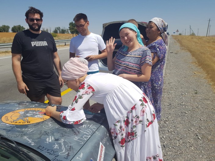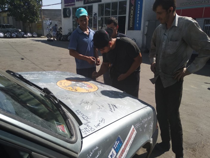 По пути следования Мартин и Тяша предлагали всем желающим расписаться на капоте своего авто. Детально разглядев кузов машины, можно заметить автограф некого Бауки из Жетысая (город в Туркестанской области - прим. авт.).