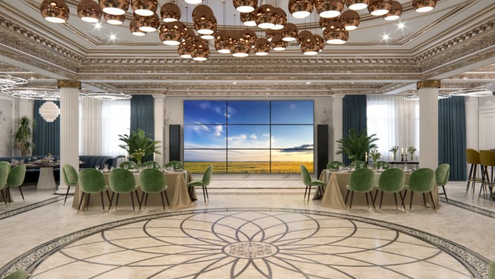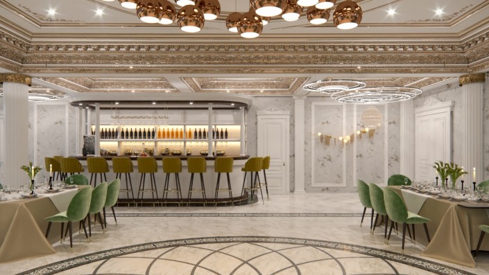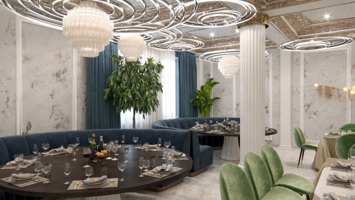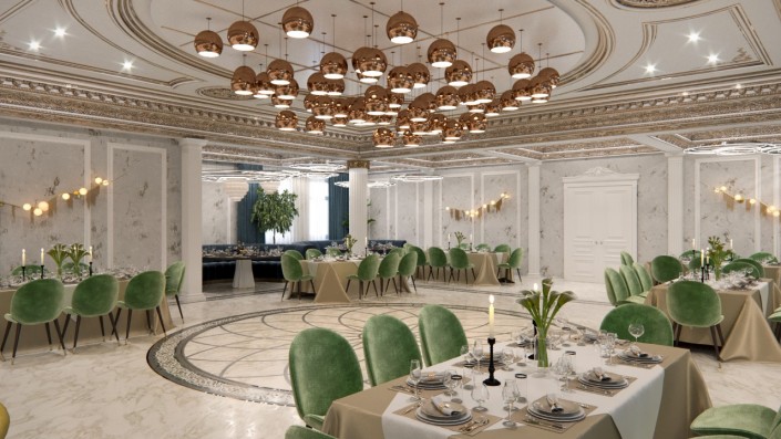 Изнутри зал ресторана отделан материалами теплых тонов, с элементами под золото.