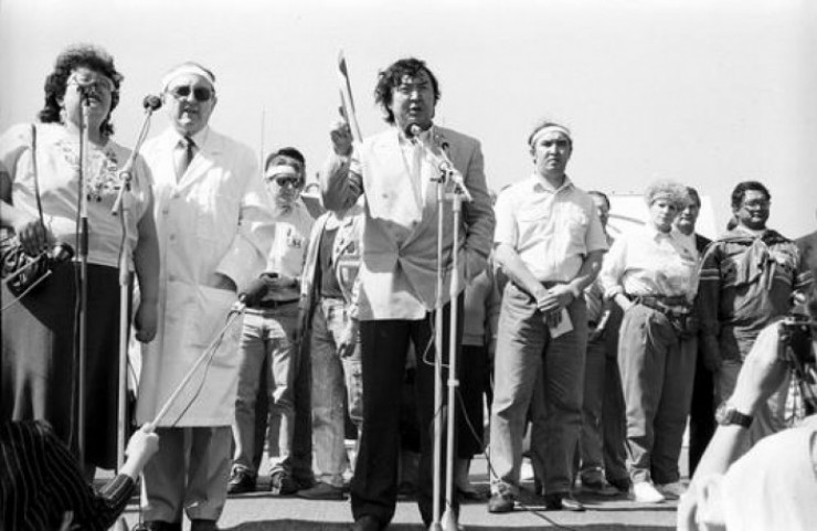 "Невада-Семей" антиядролық қозғалысын құрған себебіміз - Қазақстанда ядролық сынақтарды тоқтату. Біз өз жерімізде қауіпсіздік пен тыныштық үшін күресуге құқығымыз бар. Бүгін біз ядролық сынақ полигонының маңына қазақтың Қарауыл кентіне жиналдық. Бұл жер Батыс пен Шығысты түйістіреді. Ядросыз қаруға күресетіндердің халықаралық ынтымақтастық күні біз сіздерден жер бетінде қауіпсіздік орнату үшін өзара мораторий орнатуларыңызды сұраймыз. Бұл күндері адамзат жер бетінен қырылып қалмауы үшін бұл мәселе шешілуі тиіс".