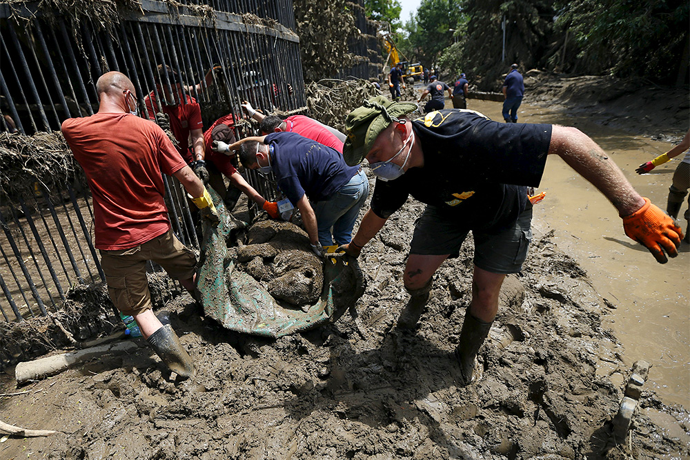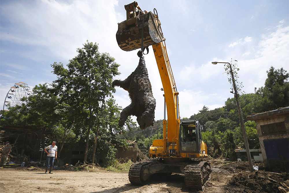 В зоопарке в Тбилиси продолжаются работы по ликвидации последствий наводнения, сообщает Газета.RU. Многих питомцев находят мертвыми под завалами мусора и грязи. Работники зоопарка грузят мертвых медведей и бегемотов в спецмашины. Издание публикует душераздирающие фотографии из тбилисского зоопарка, в котором от наводнения погибли по меньшей мере 300 животных.