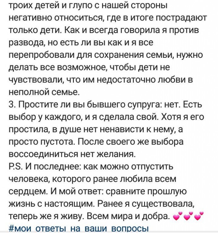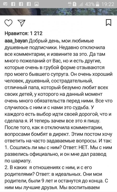 "Этим постом хочу ответить на часто задаваемые вопросы. Итак: 1. Сошлись ли мы с ним? Ответ: НЕТ. Мы с ним развелись официально, и он мне дал развод по шариату. 2. В каких я отношениях с ним, и с его родителями? Ответ: в идеальных. Они мои родители, были 9 лет и останутся до конца. С ним мы лучшие друзья. Мы воспитываем троих детей и глупо с нашей стороны негативно относиться, где в итоге пострадают только дети. Как и всегда говорила я против развода, но есть ли вы как и я все перепробовали для сохранения семьи, нужно делать все возможное, чтобы дети не чувствовали, что им недостаточно любви в неполной семье. 3. Простите ли вы бывшего супруга: нет. Есть выбор у каждого, и я сделала свой. Хотя я его простила, в душе нет ненависти к нему, а просто пустота. После своего же выбора воссоединиться нет желания. P.S. И последнее: как можно отпустить человека, которого ранее любила всем сердцем. И мой ответ: сравните прошлую жизнь с настоящим. Ранее я существовала, теперь же я живу. Всем мира и добра", - написала Баян Акимжанова.