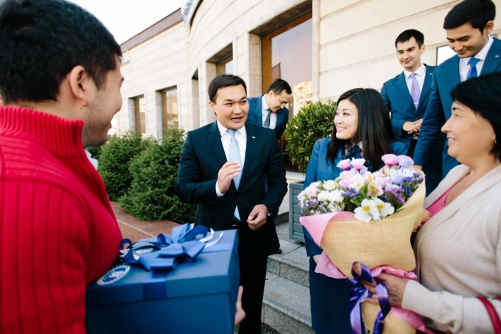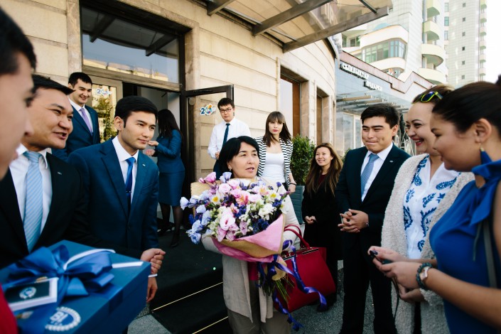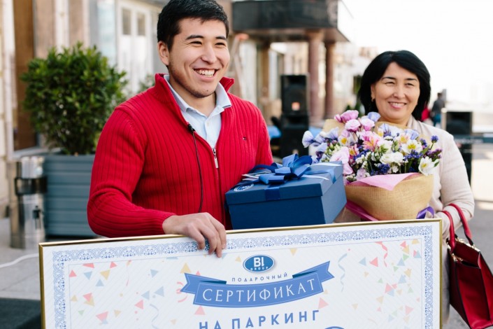 К музыкантам присоединилась алматинская команда BI Group во главе с Айдосом Мукатаевым, генеральным директором дивизиона "МЖК-Алматы", он преподнес счастливой клиентке цветы и сертификат на паркинг.