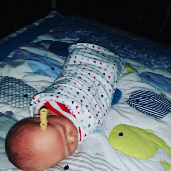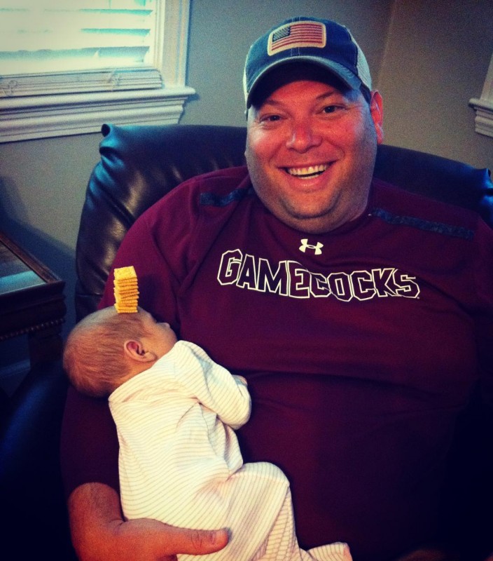 По правилам соревнования, нужно сложить на лбу у спящего младенца башенку из кукурузных колечек. Чем выше башенка, тем круче отец.