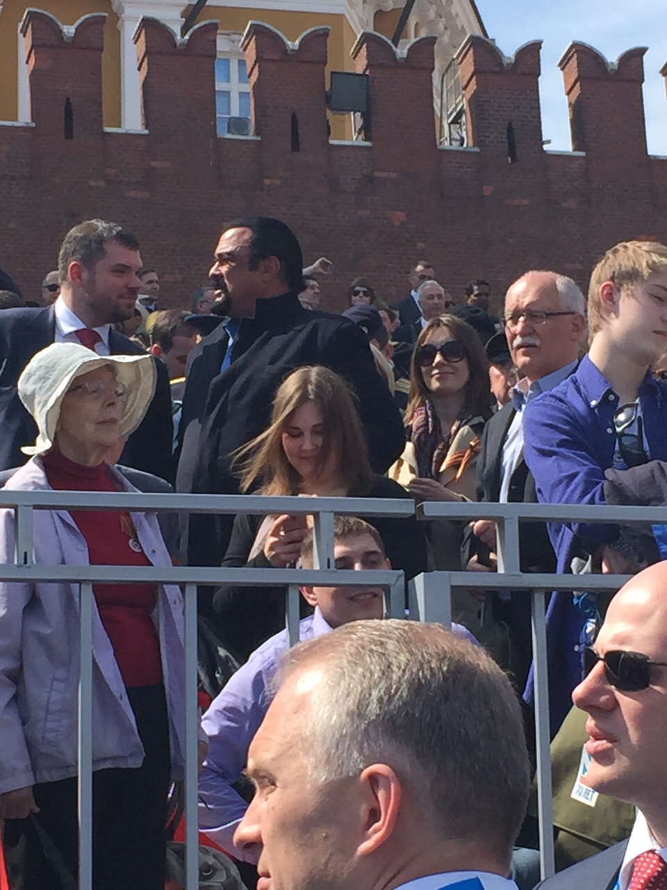 В этой же части трибуны находилась и делегация ветеранов Великой Отечественной войны из Казахстана в составе шести человек. После парада Стивен Сигал охотно фотографировался со всеми желающими.