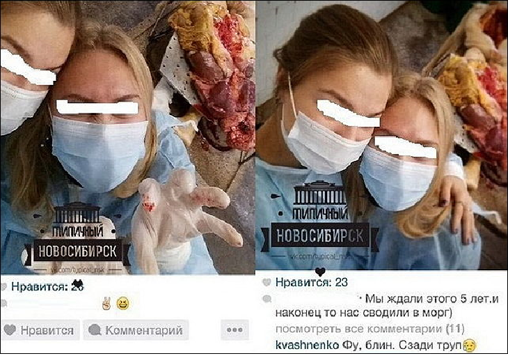 Две студентки из Новосибирска навлекли на себя гнев общественности после того, как на днях разместили в социальных сетях фотографии из морга, на которых девушки позируют на фоне человеческих органов и расчлененных трупов. В частности, снимки были опубликованы в паблике "Типичный Новосибирск" в "ВКонтакте", набрав кучу комментариев.