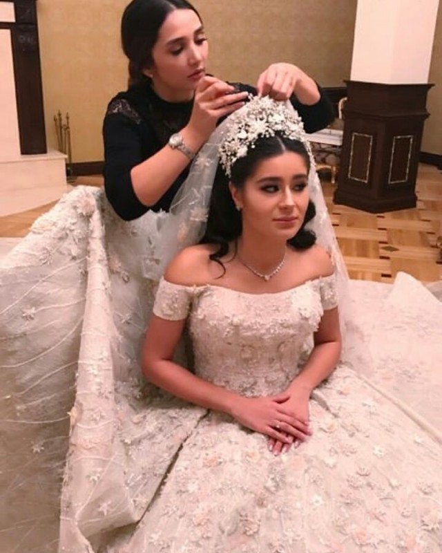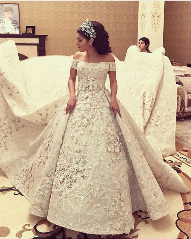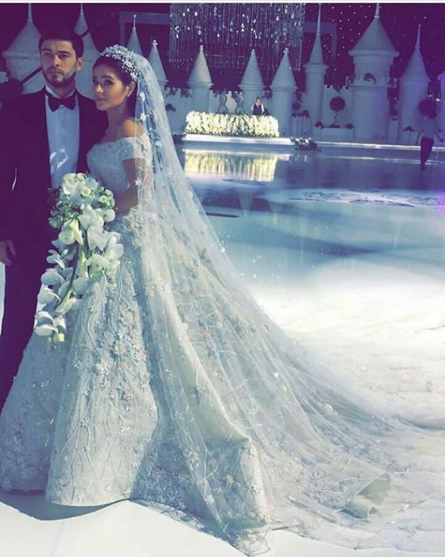 Невеста предстала перед гостями в платье, украшенном драгоценными камнями, с длинным шлейфом. Наряд сшил по специальному заказу американский дизайнер ливанского происхождения Рами Кади.