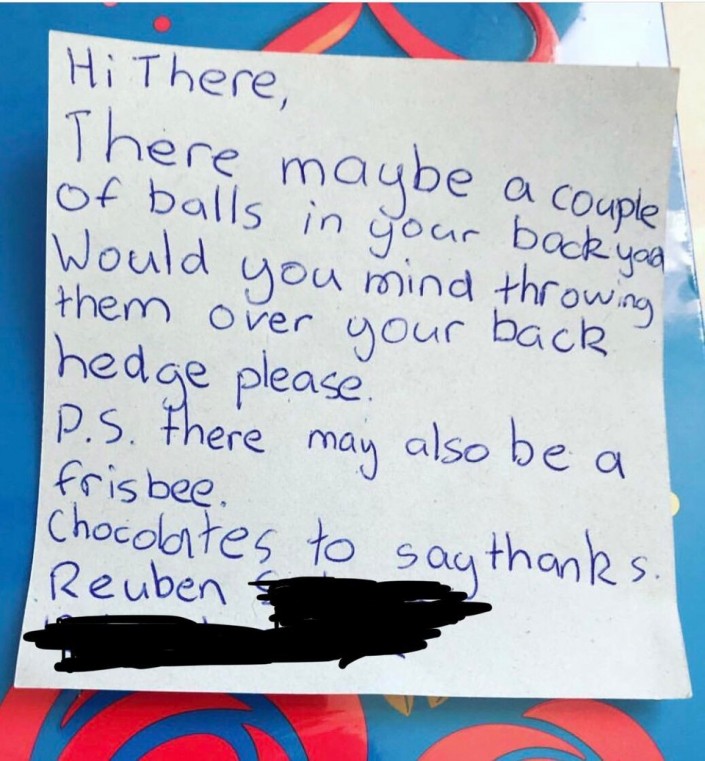 "Привет. Возможно, в вашем дворе оказалось несколько мячей. Не могли бы вы перекинуть их обратно через изгородь, пожалуйста? P.S. Наверное, там еще и фрисби. Шоколадные конфеты в знак благодарности", - написал "маленький джентльмен".
