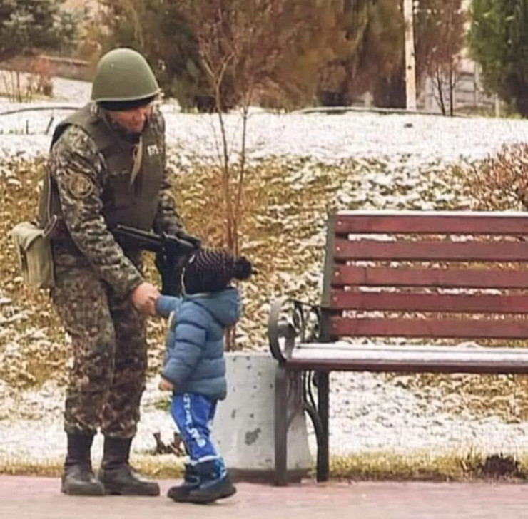 Қаңтардың басында ел ішінде дүрбелең болып жатқанда көңіліне қаяу түскен халықтың жүрегіне жылу сыйлаған жауынгер мен баланың суреті Желіде тараған еді. Кадрдағы ер адам - Ұлттық ұланның жауынгері болып шықты. ҚР Ұлттық ұланы "Оңтүстік" өңірлік қолбасшылығының баспасөз қызметі Tengrinews.kz тілшісіне суреттегі жауынгердің кім екенін және кадр қашан, қайда түсірілгенін айтып берді.