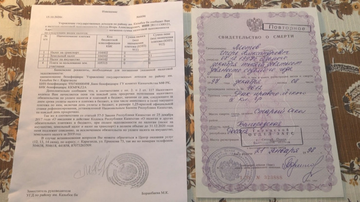 Несколько дней назад Антонина Тациева получила извещение о том, что ее отец, Мотов Игорь Александрович, должен уплатить пеню по налогу на землю. Всего 11 тенге, но ужас в том, что отца женщина похоронила еще 23 года назад.