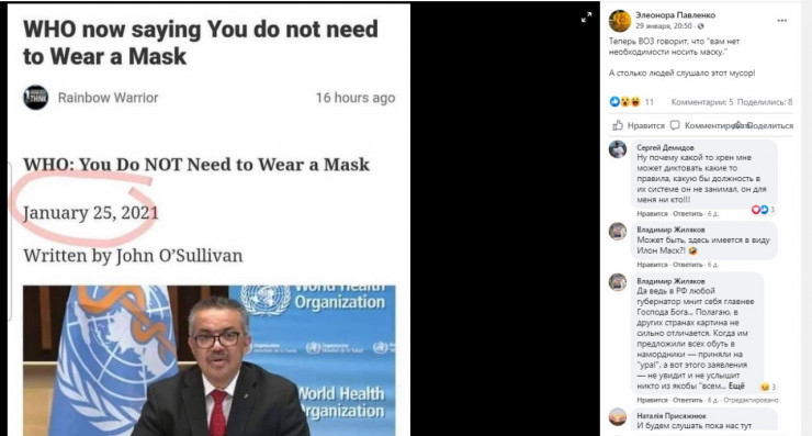 Ақпан айының басында Желіде Дүниежүзілік денсаулық сақтау ұйымының "мәлімдемесі" қызу талқыға түсті. Бұл ақпаратқа сәйкес, ұйым өкілдері "енді медициналық маска тағудың қажеті жоғын" айтқан.
