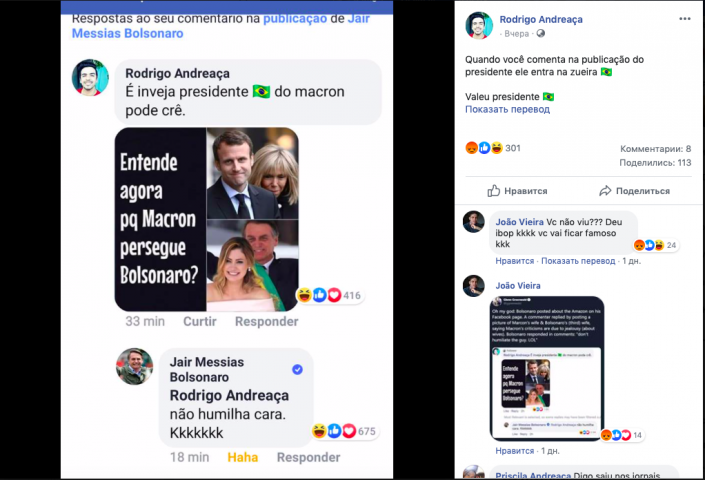 Позже президент Бразилии Жаир Болсонару удалил свой комментарий к ироничному коллажу.