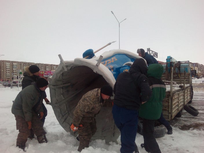 Сегодня скульптуру установили перед нед­авно открывшимся Домом дружбы на Юго-Вос­токе Караганды. Дед Мороз со светящимся ­посохом поставили около елки. Авторы кон­струкции тщательно вытерли каждый сантим­етр своего "детища" и даже поверили скульптуру на прочность,­ встав на руки сказочного персонажа.