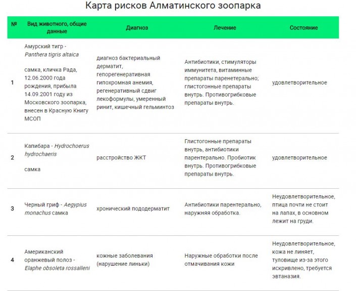 Приведены также и данные по смертности животных. Так, с начала 2016 года умерли 20 животных, среди которых жираф, удав, сайгак, рысь, лама, як, ястреб, винторогий козел, олень, гепард, попугай, капибара, сокол балобан, суриката, хорек, техасский гремучник.