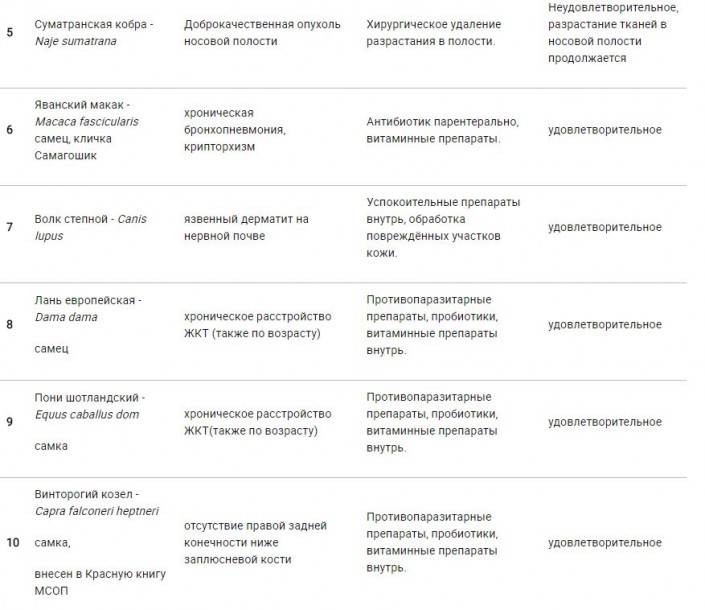В тяжелом состоянии числятся самка черного грифа, американский оранжевый полоз и суматранская кобра. Кроме того, в списке значатся те животные, которые болеют различными заболеваниями, но их состояние оценивается как удовлетворительное.