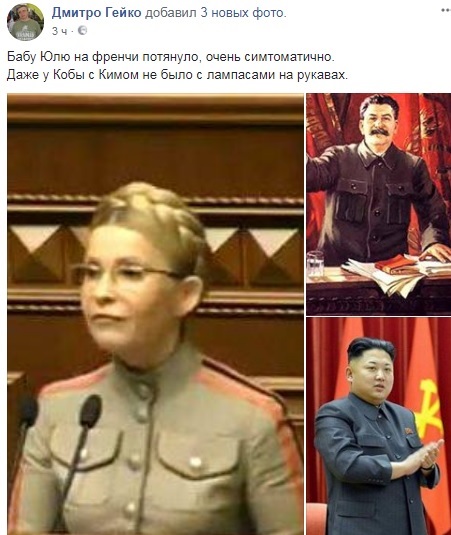 Комментаторы уже сравнивают костюм бывшего премьер-министра страны с френчами Иосифа Сталина и Ким Чен Ына: "Ну, как фюрер", "Готовится воевать за президентское кресло, униформу подготовила", "Боевая баба", "Плавно переходит на "адидасы", там тоже лампасы есть на штанах".