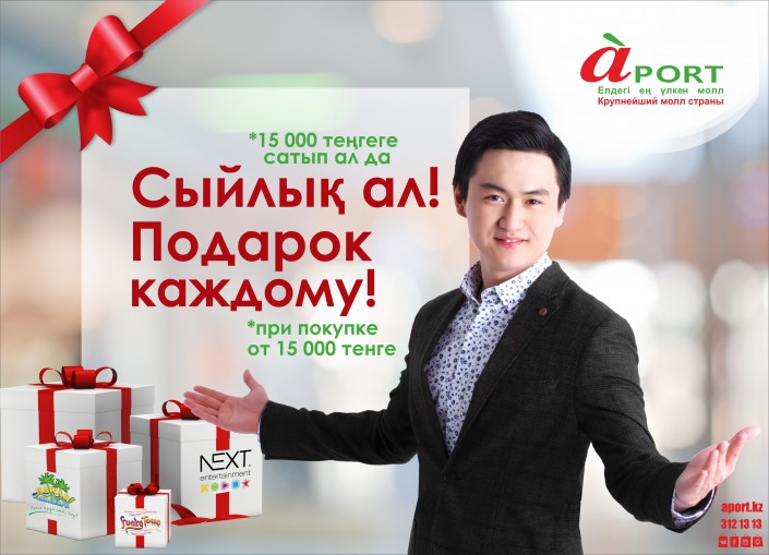 Мы постоянно укрепляем покупательскую лояльность. Например, сейчас в молле "Апорт" проходит уникальная акция "Подарок каждому". Посетитель, совершивший покупки на 15 000 тенге, получит гарантированные презенты. Это детский билет на полный будний день в Аквапарк Hawaii, купон на 30 минут бесплатной игры в центр развлечений NEXT, сертификат на три аттракциона в развлекательный парк Funky Town, сертификаты для всей семьи на посещение фитнес-центра Hawaii Fitness.