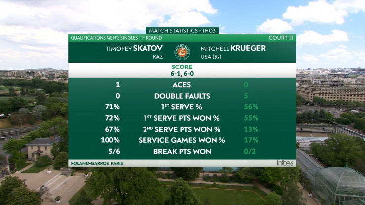В первом квалификационном раунде "Ролан Гаррос" Скатов (№ 191) разгромил 32-го сеяного из США Митчелла Крюгера (№ 145) - 6:1, 6:0. Любопытно, но в начале года на одном из небольших турниров в Австралии Крюгер с таким же счетом разделался с Тимофеем. Даже продолжительность этих двух игр разнится всего на минуту - час и четыре минуты в Австралии, теперь час и пять минут во Франции.
