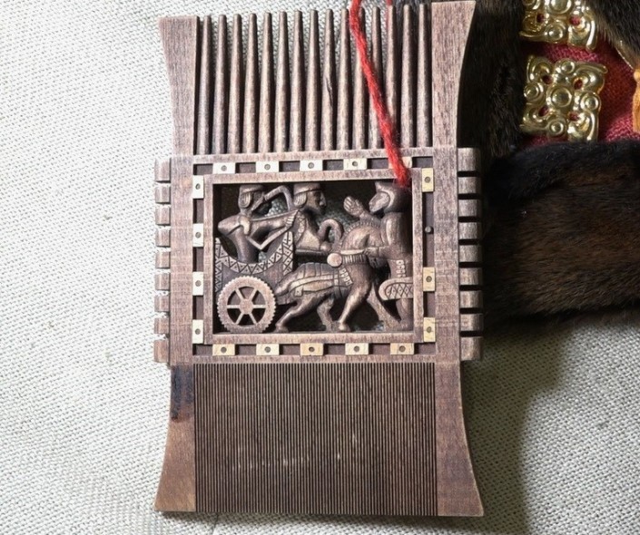 Женщина принадлежит племени саков-тиграхауда, носивших остроконечные шапки. Ее возраст - 17-20 лет. Принадлежность к знатному роду подтверждают 80 золотых украшений, две стражницы, захороненные рядом, и уникальный гребень, на котором изображена батальная сцена между сарматами и персами.
