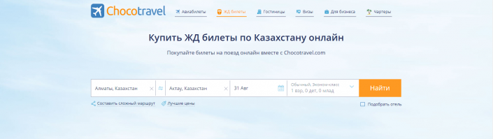 Купить билеты на поезд в Казахстане без очередей и долгих ожиданий поможет онлайн-сервис Chocotravel.com. Портал входит в топ-25 агентств по поиску и покупке ж/д билетов по различным направлениям.