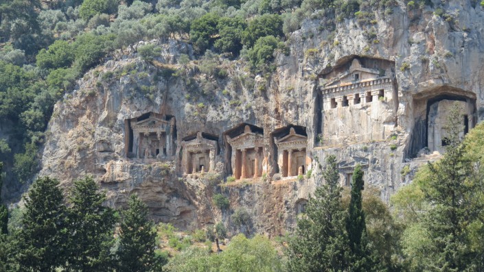 Античные некрополи на реке Дальян видны издалека. Но еще сильнее впечатляют, если смотреть на них, стоя у подножия скального массива. В Турции таких захоронений не одна сотня. При этом разбросаны они по огромной территории. Самые известные находятся в Фетхие, Амасье (могилы понтийских царей) и на реке Дальян. Это захоронения ликийского периода. Сама древняя Ликия располагалась на территории современных турецких провинций Мугла и Анталья. Согласно древнегреческому мифу, богиня Лето (мать Аполлона и Артемиды), рожавшая в горах Малой Азии, дала ей такое название в память об охранявших ее волках (likos - волк, греч.).