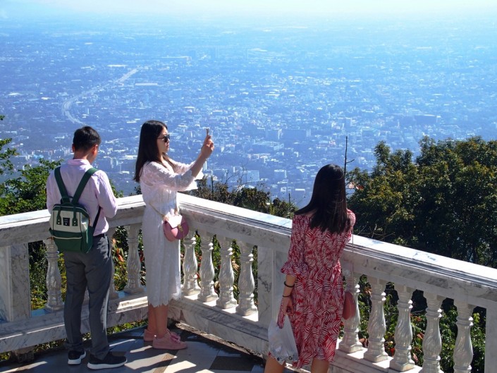 Сам комплекс состоит из двух террас. На нижней располагается часть виханов, множество скульптур Будды и монахов, есть и тот самый белый слон с ларцом на спине для перевозки реликвии. Внушительных размеров гонг, в два ряда подвешены колокола – вот только везде предупреждающие таблички, что звонить нельзя. Но самое притягательное в этой части комплекса – великолепная смотровая площадка на Чиангмай. Храм возведен на высоте чуть более 1000 метров над уровнем моря и примерно на 700 метров выше города, так что в хорошую погоду панорамы открываются великолепные.