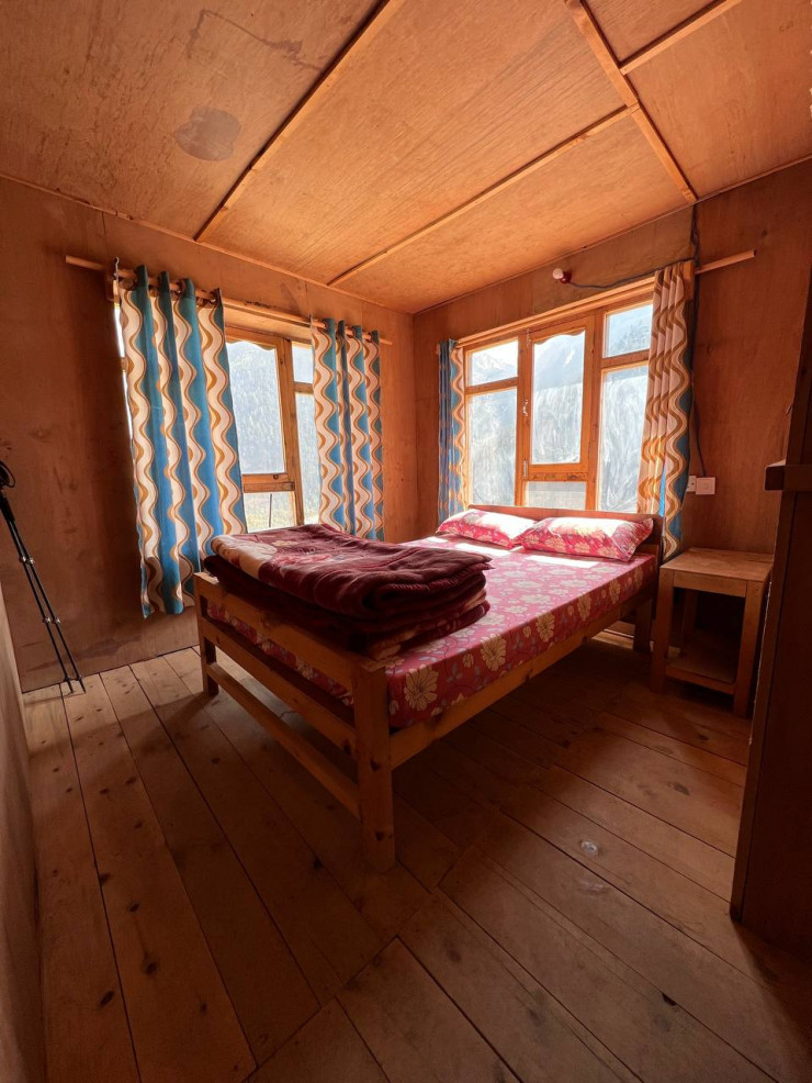 Мы начали восхождение на высоте 2 200 метров и на привал в первый день пришли в поселок Чаме на высоте 2 700 метров. Там везде есть гостевые дома. По сути, там проживают сами местные, но хозяева выделяют несколько комнат для туристов. Гостевые дома называются "лодж". Они представляют собой конструкции из дерева, где не предусмотрено отопление, и поэтому в них довольно холодно. Мы спали на кровати в спальных мешках.