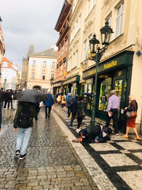 Что меня удивило в Праге, так это уличные попрошайки. Довольно молодые мужчины сидят на улицах на четвереньках в интересной позе "смирения". Говорят, что в старые времена попрошайничество было своего рода профессией. Милостыню просили в основном шахтеры, оставшиеся без работы. Как мне объяснили местные, современные попрошайки для пущего эффекта используют собак, а деньги спускают на алкоголь и наркотики. В первые дни мы им подавали, а потом здравомыслие взяло вверх.
