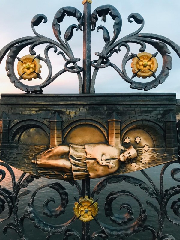 На Карловом мосту находится знаменитая бронзовая фигура покровителя Праги - святого Яна Непомуцкого. По легенде, если потереть небольшой фрагмент с изображением святого на решетке моста, то твое желание обязательно сбудется. Фигурка была натерта до блеска. Не стали нарушать традицию и мы и тоже загадали желания.