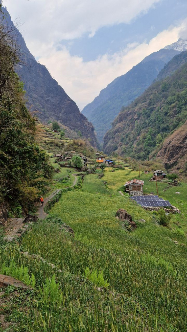 За четыре часа путешественники преодолели 13 километров с перепадом высоты 1300 метров. В итальянском базовом лагере, где они ночевали, стоит одна лоджия с простыми условиями проживания. Электричества для зарядки спутникового терминала нет, но есть грандиозный вид на западную стену пика Дхаулагири.