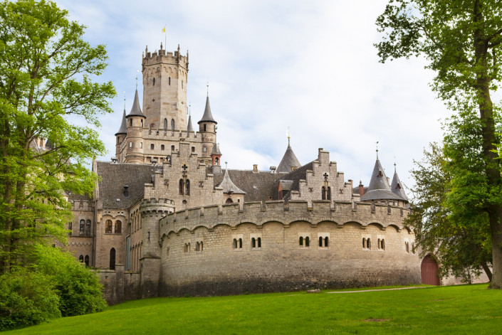Мариенбург. Этот замок расположен в 20 километрах от Ганновера, на вершине горы Мариенбер. Он является своего рода символом любви последнего монарха Ганноверского королевства Георга V к его жене Марии. Король подарил ей холм, на котором Мария построила летнюю резиденцию. Строительство замка началось в 1858 году и продолжалось девять лет. Но начавшаяся в 1866 года Австро-прусская война не дала своим хозяевам насладиться жизнью в замке. Королю Георгу V в ходе войны пришлось принять сторону Австрии и отречься от престола.
