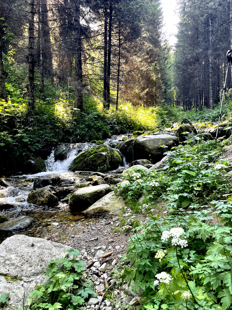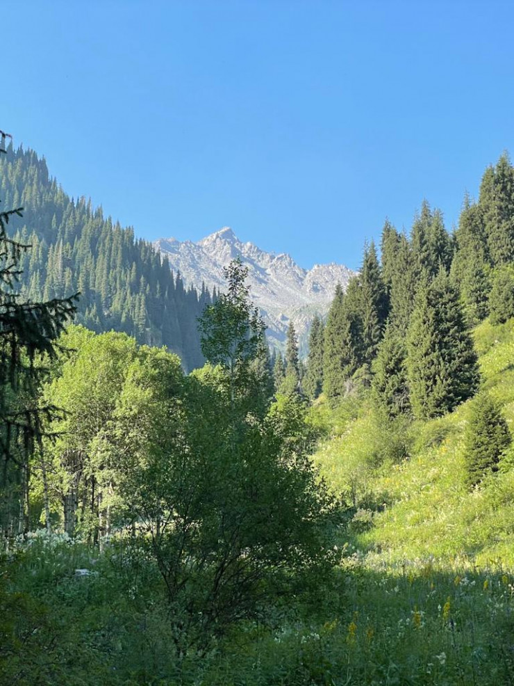 Далее необходимо идти справа от речки, откуда тропа раздваивается: мы пошли по верхней части, откуда открывается прекрасный вид на поляну с множеством растений и цветов, а вдали виден Большой Алматинский пик.