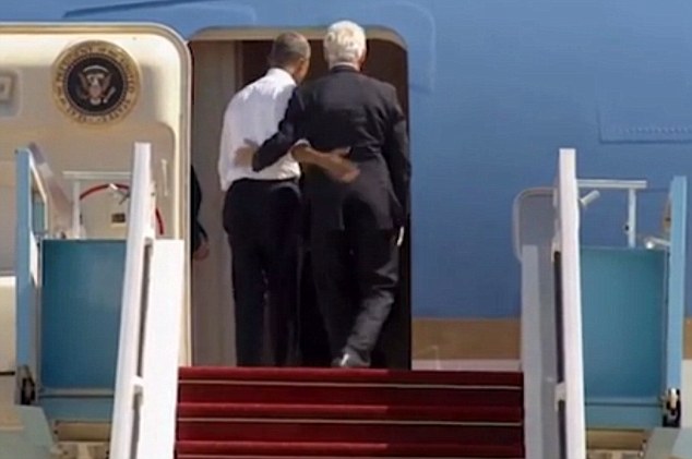 В конце концов Клинтон поднялся на борт, поприветствовал президента, пожал ему руку и похлопал по спине. Затем оба зашли в салон самолета.