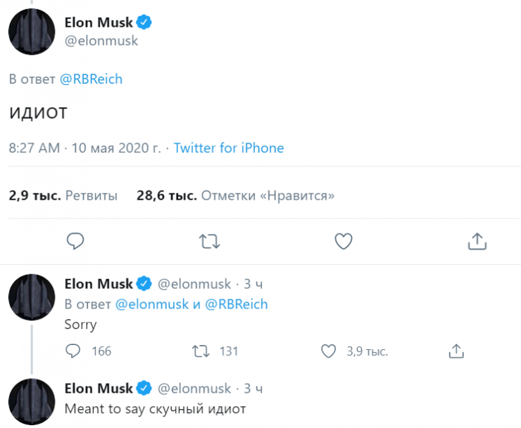 Позже Илон Маск добавил еще два твита. В одном он извинился перед экс-министром короткой фразой "Sorry", а во втором добавил: "Meant to say скучный идиот" (Хотел сказать скучный идиот. - Перевод).