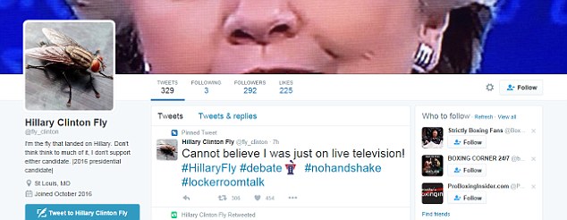 У насекомого, севшего на Клинтон, даже появился собственный аккаунт в Twitter. Страница называется "Муха Хиллари", и у нее уже есть 465 читателей. Пока опубликован только один пост. "Выражаю поддержку Хиллари! Поверить не могу, что меня показывают по ТВ!", - говорится в сообщении.