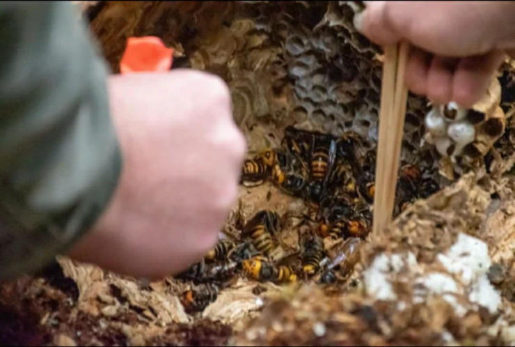 Эти насекомые, известные как азиатские гигантские шершни, могут вырасти до пяти сантиметров в длину и представляют опасность для медоносных пчел, которых они могут обезглавить за секунды.