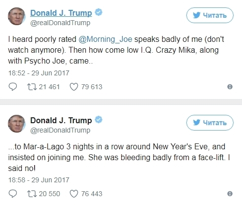 Как отмечает RT, рекордно короткая заметка стала реакцией на недавнюю перебранку американского лидера с телеведущими утренней передачи Morning Joe на телеканале MSNBC. В частности, журналисты Мика Бжезински и Джо Скарборо раскритиковали президента США, после чего Трамп в Twitter оскорбил обоих журналистов, назвав Бжезински "сумасшедшей с низким IQ", а ее напарника - "психопатом". Глава Белого дома также отметил, что оба ведущих напрашивались к нему в гости на Новый год, причем у Бжезински было "сильное кровотечение" из-за пластической операции на лице.