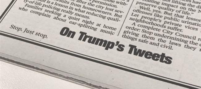 Американская газета New York Post опубликовала статью в адрес президента США Дональда Трампа, состоящую всего из трех слов. "Остановись. Просто остановись", - говорится в публикации, посвященной активности Трампа в Twitter.